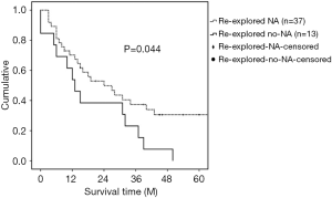 The median survival for patients who underwent resection after a previous exploration was 19 months (Figure 1). Median survival of the resected patients who received neoadjuvant therapy before re-exploration (median 24 months; 95% CI 10.6–37.4) was longer than the median survival for those who did not receive neoadjuvant therapy (median 13 months; 95% CI 7.1–18.9) (Log rank: P=0.044) (Figure 2).