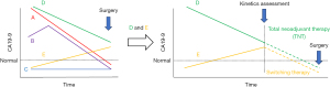 Pancreatic ductal adenocarcinoma (PDAC) remains the most lethal type of human cancer due to its high chemoresistance and invasiveness (2). In resected PDAC, the median overall survival (OS) has increased from 22.1 to 35 months during the past 10 years, largely owing to improvements in adjuvant therapies (3,4). On the other hand, surgical resection offers the only chance of cure, but surgery can be associated with significant morbidity and decreased activities of daily living (ADL), especially in the Whipple procedure (pancreaticoduodenectomy). Recently, the importance of preoperative chemotherapy even in operable PDAC has been increasingly recognized (5). Although molecular markers are used more frequently in patients selected for systemically targeted agents, only imaging modalities are used to stage patients and assess their suitability for surgical resection. Decisions regarding initial surgery or neoadjuvant approaches are made in the absence of biological indicators to assess the risk of aggressive tumors or occult metastatic disease. In this unique study, the authors aim to establish a new classification system (A-B-C-D-E) by analyzing the dynamic changes of serum carbohydrate antigen 19-9 (CA19-9) during neoadjuvant therapy (NT) in PDAC patients and assess its relationship with post-resection survival. The research reveals that, compared to the sole normalization of CA19-9, this classification system more accurately predicts post-resection survival in PDAC patients. It provides valuable information for patients, caregivers, and clinicians regarding potential surgical outcomes. Overall, this novel and practical classification scheme offers more instructive insights for treatment decisions in PDAC patients. It was described as the “A”lways decreasing to normal; “B”idirectional to normal; “C”onsistently normal; “D”ecreasing without normalization; and “E”levating without normalization (Figure 1). Then, the prognostic outcomes of the different kinetics in response to NT were ordered as follows, revealing a longest-to-shortest type ranking of OS as A→B→C→D→E; relapse-free survival as B→A→D→C→E. Thus, Dr. Newhook and colleagues successfully elucidated the prognostic impact of tumor marker kinetics and normalization during neoadjuvant chemotherapy for PDAC.