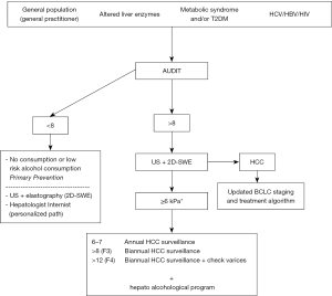 More recently, in a cross-sectional analysis of patients with liver disease worldwide, Shah et al. (9) found that patients with ALD are seen with more advanced stage disease than patients with HCV-associated liver disease. Of patients with 2 etiologies of liver disease, excess alcohol use was associated with 50% of cases. It is necessary to identify subjects with LF early and subsequently subject them to personalized therapy to eliminate the etiological factors of liver injury through common international guidelines. Therefore, all patients with AUD should undergo initial access to ultrasonography (US) with elastography for early detection of LF or HCC.