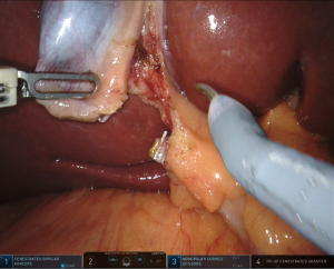 At this stage, the Firefly mode for fluorescence ICG imaging can be a valuable tool for identifying tumor and transection margins for demarcation. When administered perioperatively it also facilitates biliary tract identification.