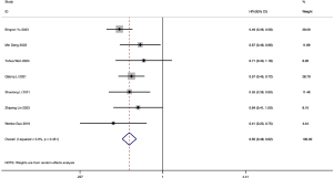 Seven studies investigated the comparative impact of HAIC and TACE on PFS in advanced HCC (26,28,30,31,33,35,37). The pooled analysis demonstrated that HAIC significantly improved PFS, with a HR of 0.55 (95% CI: 0.48–0.62; P<0.001) (Figure 3).