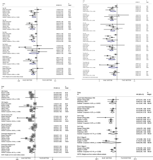 Five studies assessed 26 prognostic factors affecting OS between HAIC and TACE in advanced HCC. These factors included age, gender, ECOG performance status, Child-Pugh class, AFP levels, tumor size, tumor number, HBV status, vascular invasion, extrahepatic metastasis, lymph node metastasis, and PVTT. In nearly all subgroups, HAIC showed superior survival outcomes compared to TACE, with significant differences in the following groups: age >60 years (HR =0.67, 95% CI: 0.55–0.80), age ≤60 years (HR =0.45, 95% CI: 0.32–0.64), male (HR =0.60, 95% CI: 0.52–0.68), female (HR =0.60, 95% CI: 0.41–0.88), ECOG 0 (HR =0.49, 95% CI: 0.36–0.65), ECOG ≥1 (HR =0.65, 95% CI: 0.53–0.80), AFP <400 ng/mL (HR =0.59, 95% CI: 0.47–0.75), AFP ≥400 ng/mL (HR =0.48, 95% CI: 0.39–0.60), tumor size ≥10 cm (HR =0.54, 95% CI: 0.45–0.64), tumor size <10 cm (HR =0.62, 95% CI: 0.51–0.75), tumor number ≥3/5 (HR =0.69, 95% CI: 0.57–0.84), tumor number <3/5 (HR =0.49, 95% CI: 0.35–0.70), Child-Pugh A (HR =0.63, 95% CI: 0.51–0.76), HBV positive (HR =0.55, 95% CI: 0.47–0.65), HBV negative (HR =0.61, 95% CI: 0.40–0.94), vascular invasion yes (HR =0.49, 95% CI: 0.27–0.91), vascular invasion no (HR =0.66, 95% CI: 0.52–0.85), extrahepatic metastasis no (HR =0.57, 95% CI: 0.48–0.69), and PVTT present (HR =0.35, 95% CI: 0.22–0.55). PVTT absent (HR =0.52, 95% CI: 0.30–0.91), Barcelona Clinic Liver Cancer (BCLC) Stage C (HR =0.64, 95% CI: 0.52–0.80). These results suggest that HAIC generally offers better survival outcomes across multiple prognostic factors in advanced HCC patients, with statistically significant improvements in several key subgroups. Detailed information is presented in Figure 5.